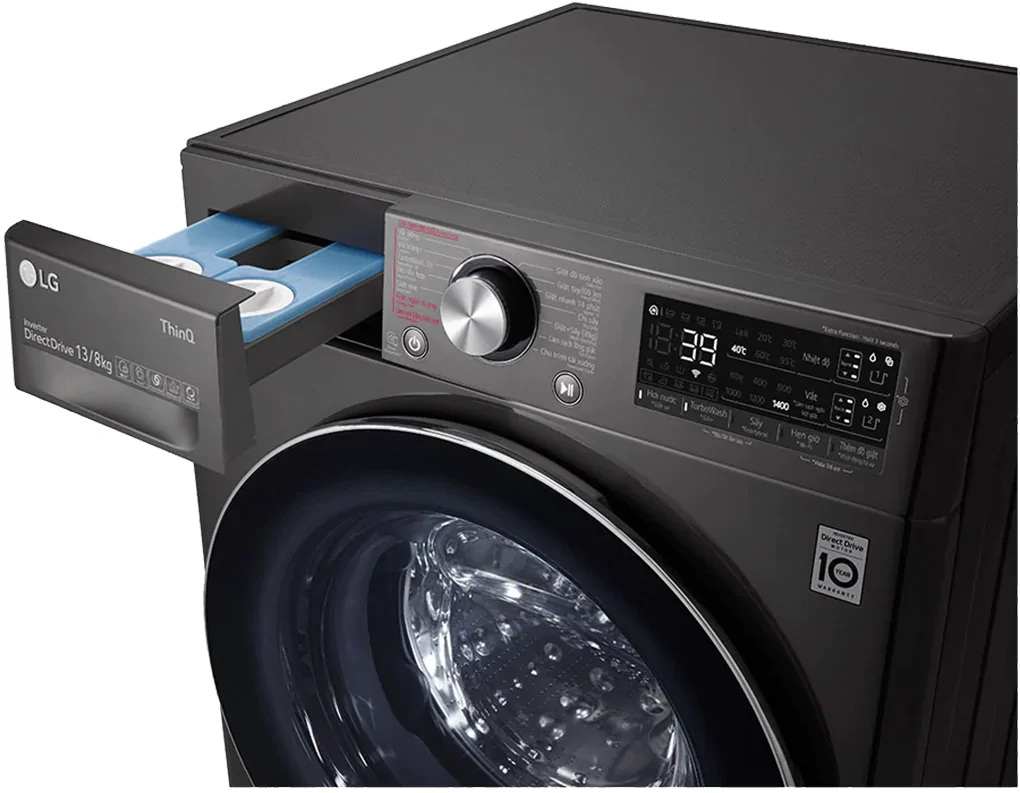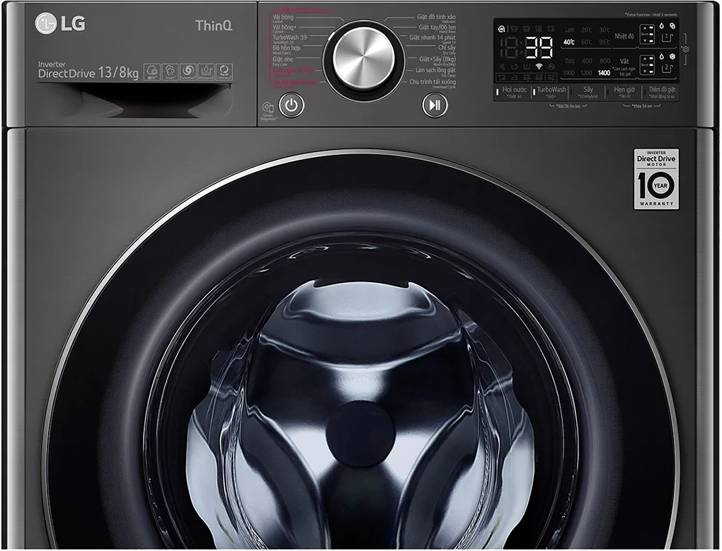 Mẫu máy giặt LG này có khối lượng giặt là 13kg và sấy là 8kg khá phù hợp với nhu cầu giặt giũ cho các gia đình có đông người (trên 7 thành viên) hoặc không có nhiều thời gian, không gian phơi khô quần áo.