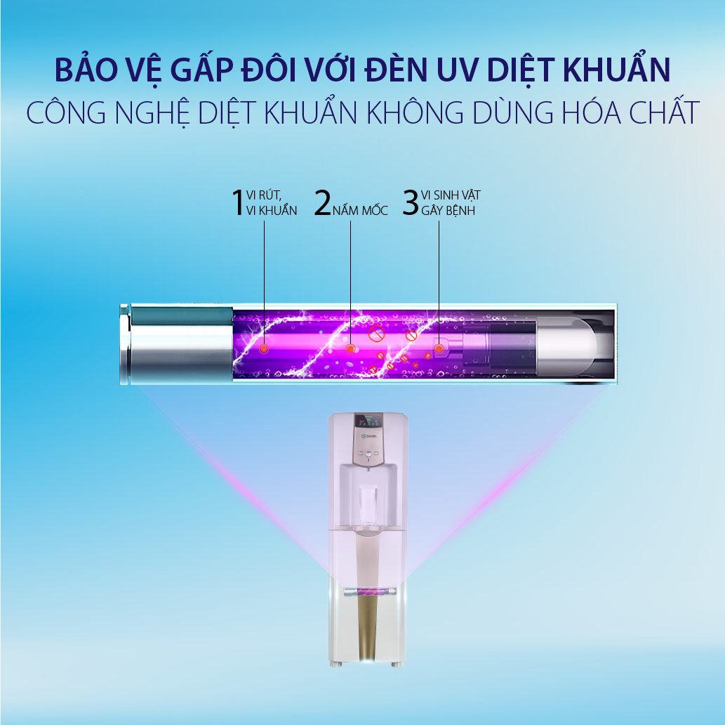 Bảo vệ gấp đôi với công nghệ diệt khuẩn UV trong bình chứa giúp nước luôn trong điều kiện tinh khiết nhất.