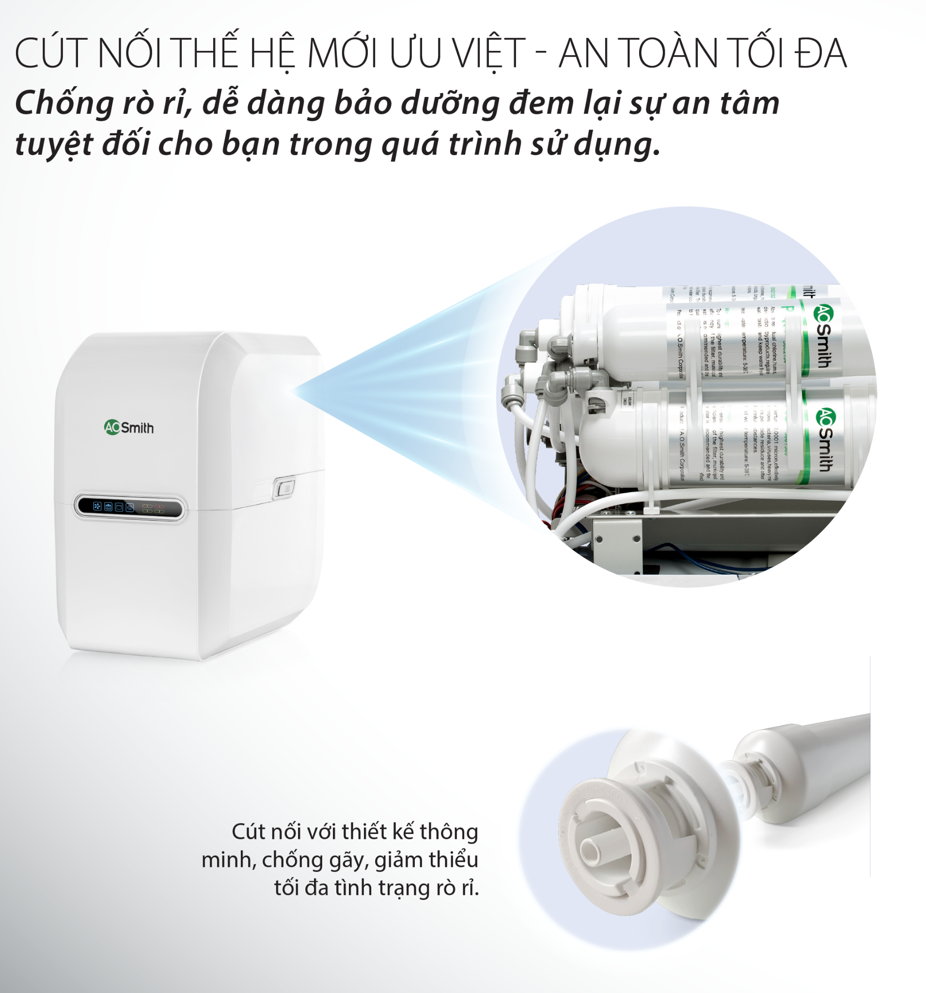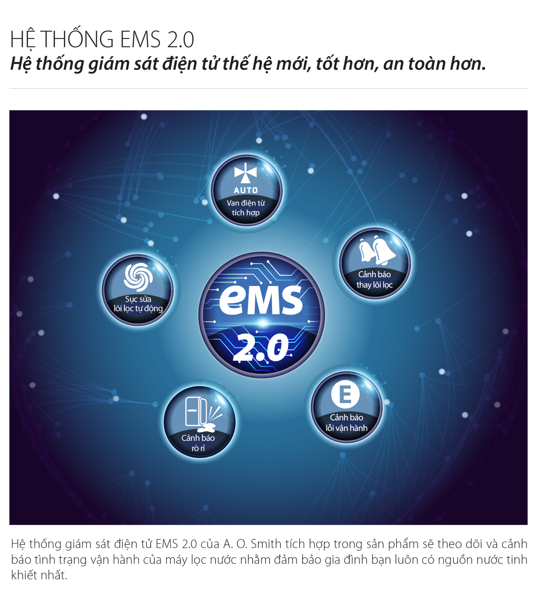 Hệ thống giám sát điện tử EMS 2.0 thế hệ mới của A. O. Smith tích hợp trong sản phẩm sẽ theo dõi và cảnh báo tình trạng vận hành của máy lọc nước nhằm đảm bảo gia đình bạn có nguồn nước tinh khiết nhất. Hệ thống bao gồm các chức năng: