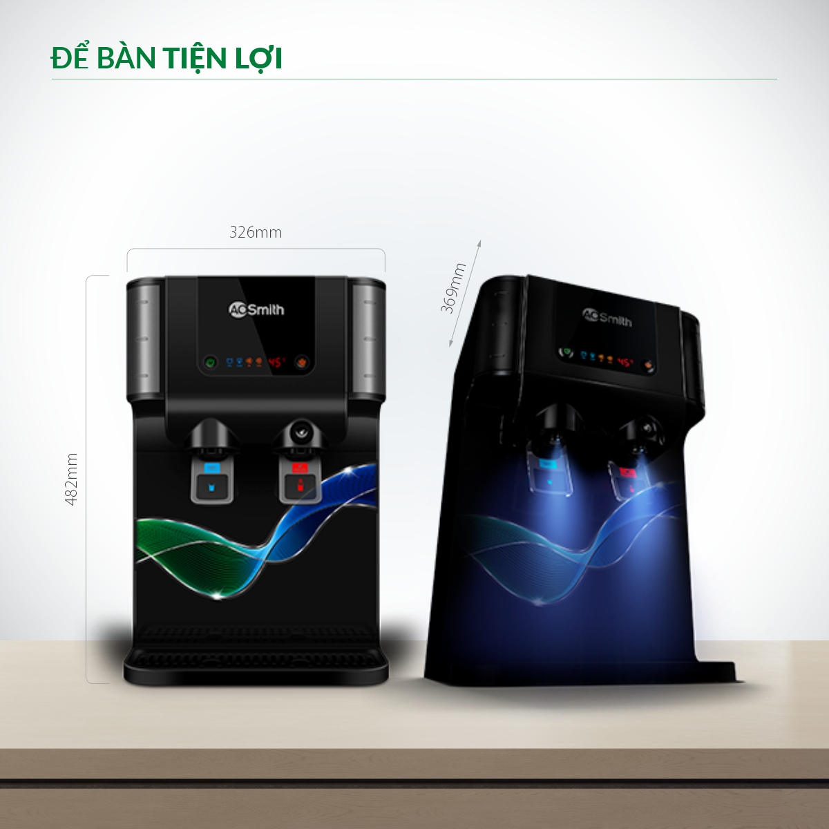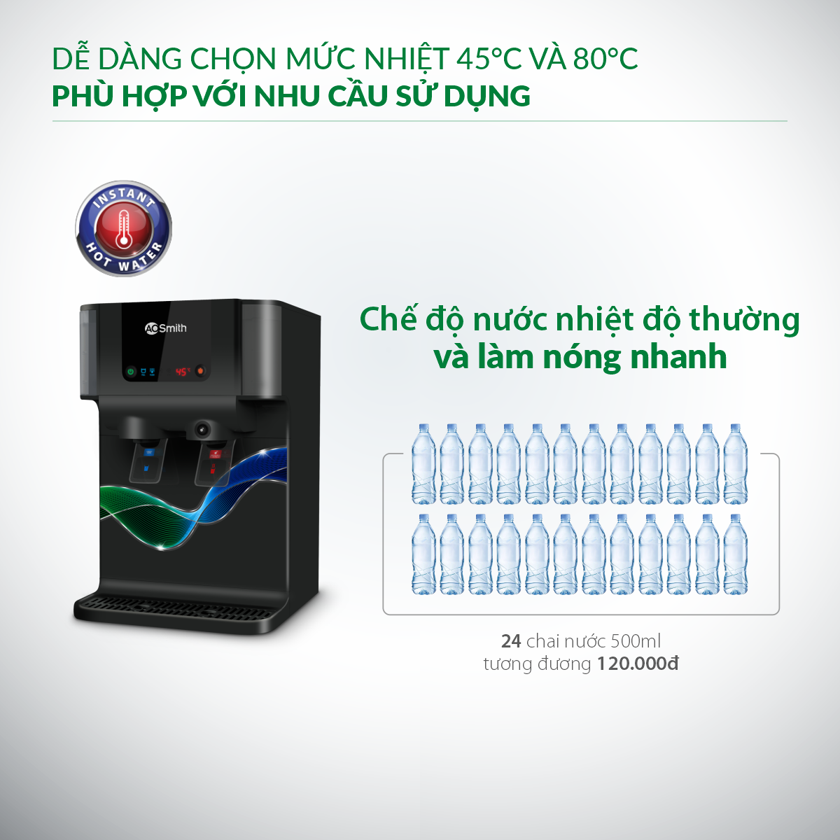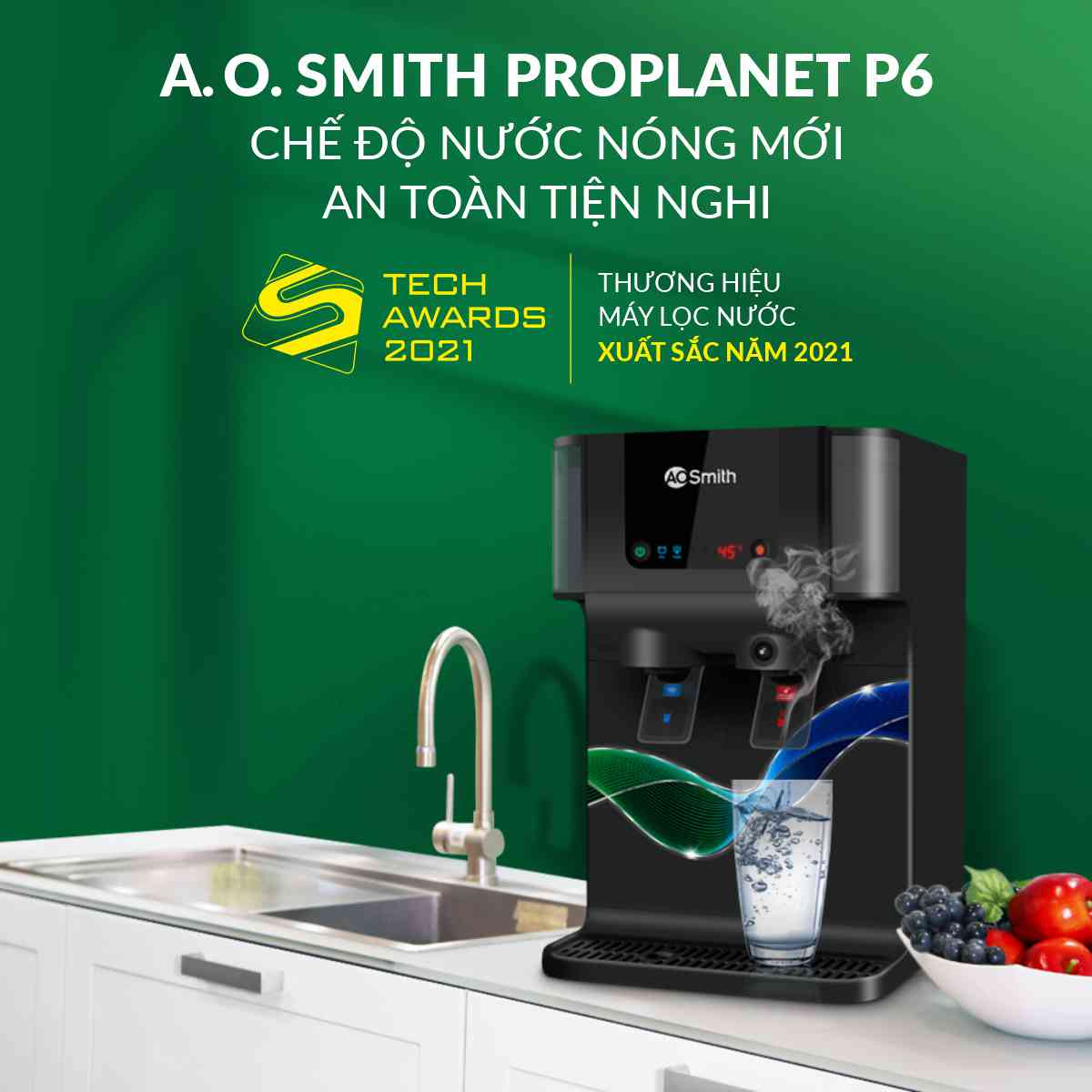 Máy lọc nước A. O. Smith P6 có 2 tính năng: nước nhiệt độ thường và làm nóng nhanh 2 chế độ nhiệt (45°C và 80°C), với dung tích bình chứa đến 9.2/0.8L (thường/nóng).
