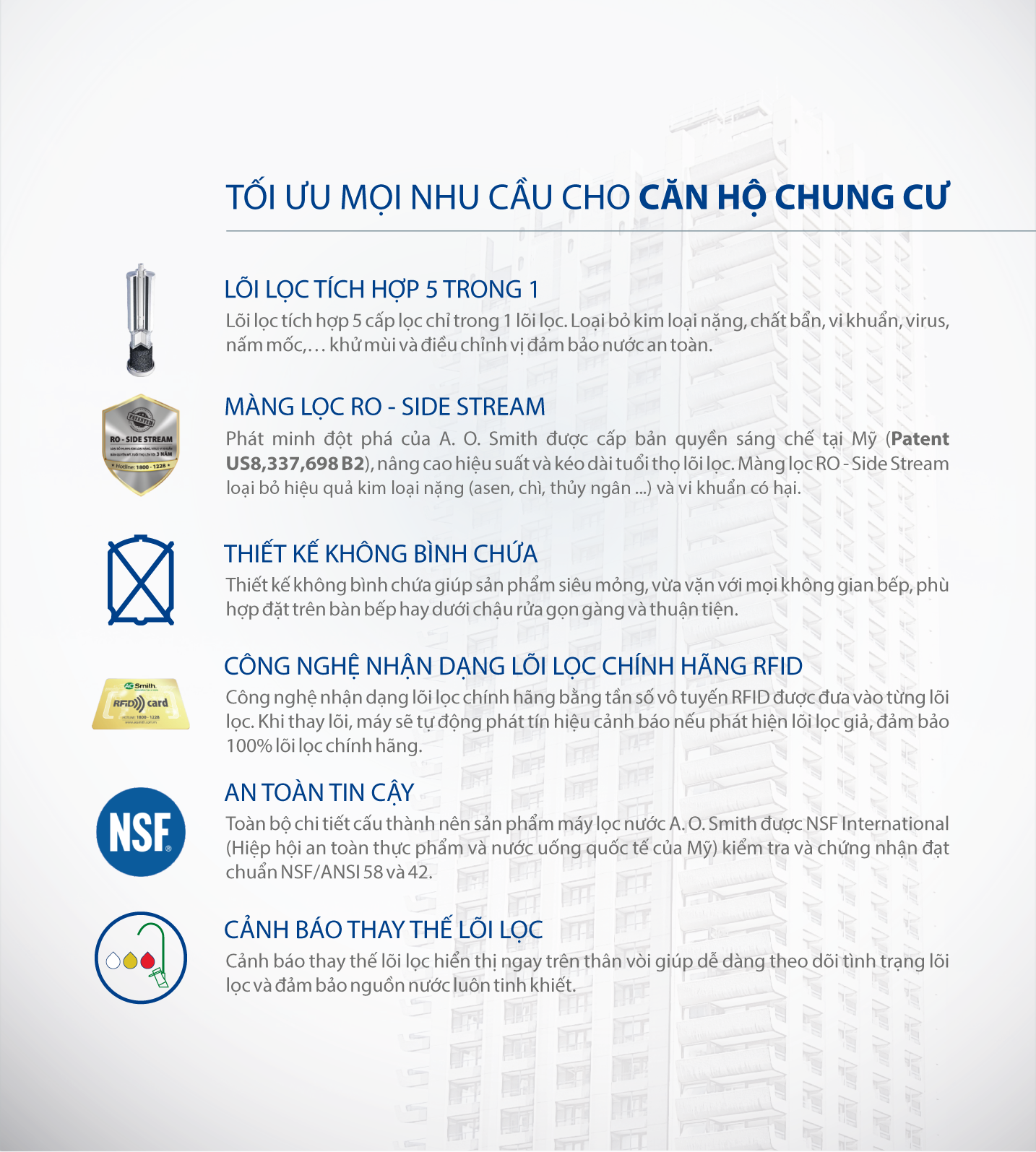 Màng lọc RO – Side Stream là phát minh đột phá của A. O. Smith, được cấp bản quyền sáng chế tại Mỹ (patent US8,337,698 B2), giúp nâng cao hiệu suất sử dụng, tăng 66% tỷ lệ nước tinh khiết, giảm 56% tỷ lệ nước thải, duy nhất cho tỷ lệ nước thải : nước tinh khiết là 1:1 và kéo dài tuổi thọ lõi lọc gấp 1.5 lần so với màng lọc RO thường, mang đến “Giải pháp tiết kiệm toàn diện” cho người sử dụng. Màng lọc RO – Side Stream loại sạch kim loại nặng (Asen, chì, thủy ngân…) và các vi khuẩn có hại.