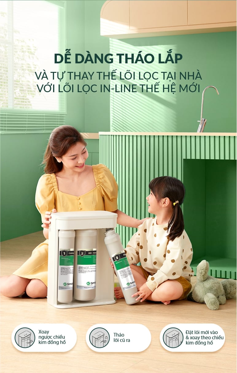 Lõi lọc nguyên khối In-line thế hệ mới hạn chế các cút nối giảm nguy cơ rò rỉ nước khi sử dụng và tháo lắp dễ dàng, có thể tự thay thế tại nhà.