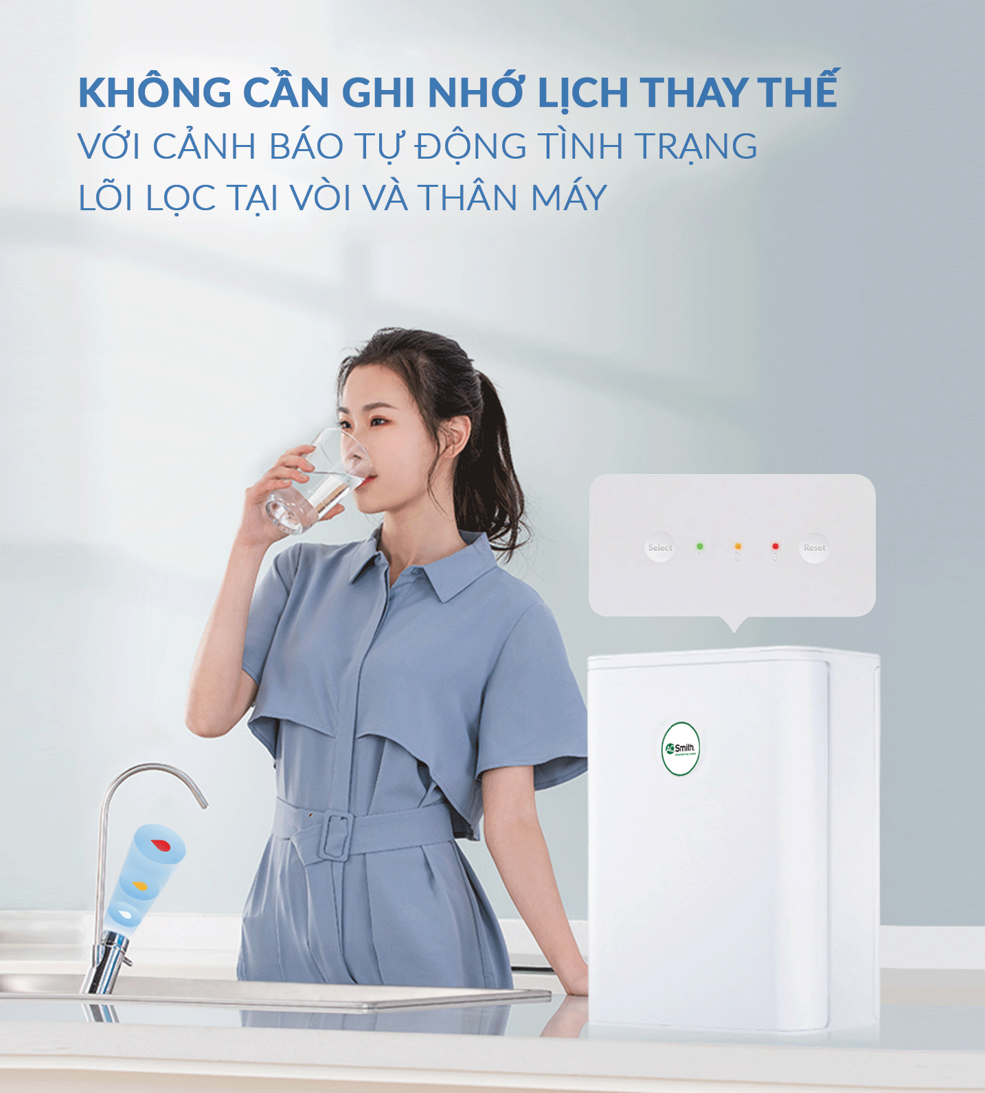 Hệ thống cảnh báo thay thế lõi lọc tự động ngay trên thân máy hoặc tại vòi nước giúp dễ dàng theo dõi tình trạng lõi lọc và đảm bảo nguồn nước luôn tinh khiết.