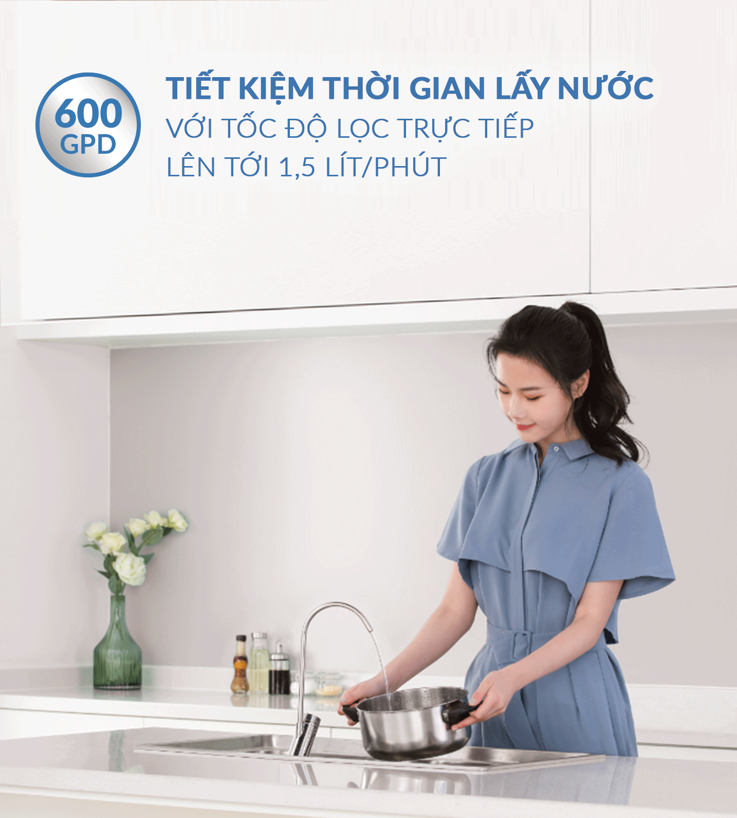 Công suất lọc lớn nhất lên tới 1.500 ml/ phút, nước được lọc trực tiếp ngay khi mở vòi đảm bảo luôn tươi mới và đáp ứng nhu cầu sử dụng nước liên tục của đại gia đình.