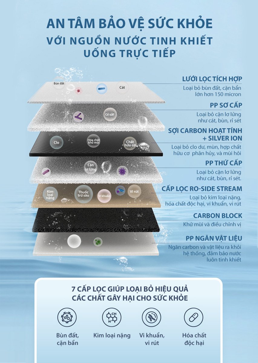 Công nghệ lọc trực tiếp cho nguồn nước luôn tươi mới, và hệ thống lõi lọc In-line đúc nguyên khối giúp ngăn chặn nguy cơ rò rỉ nước trong máy.