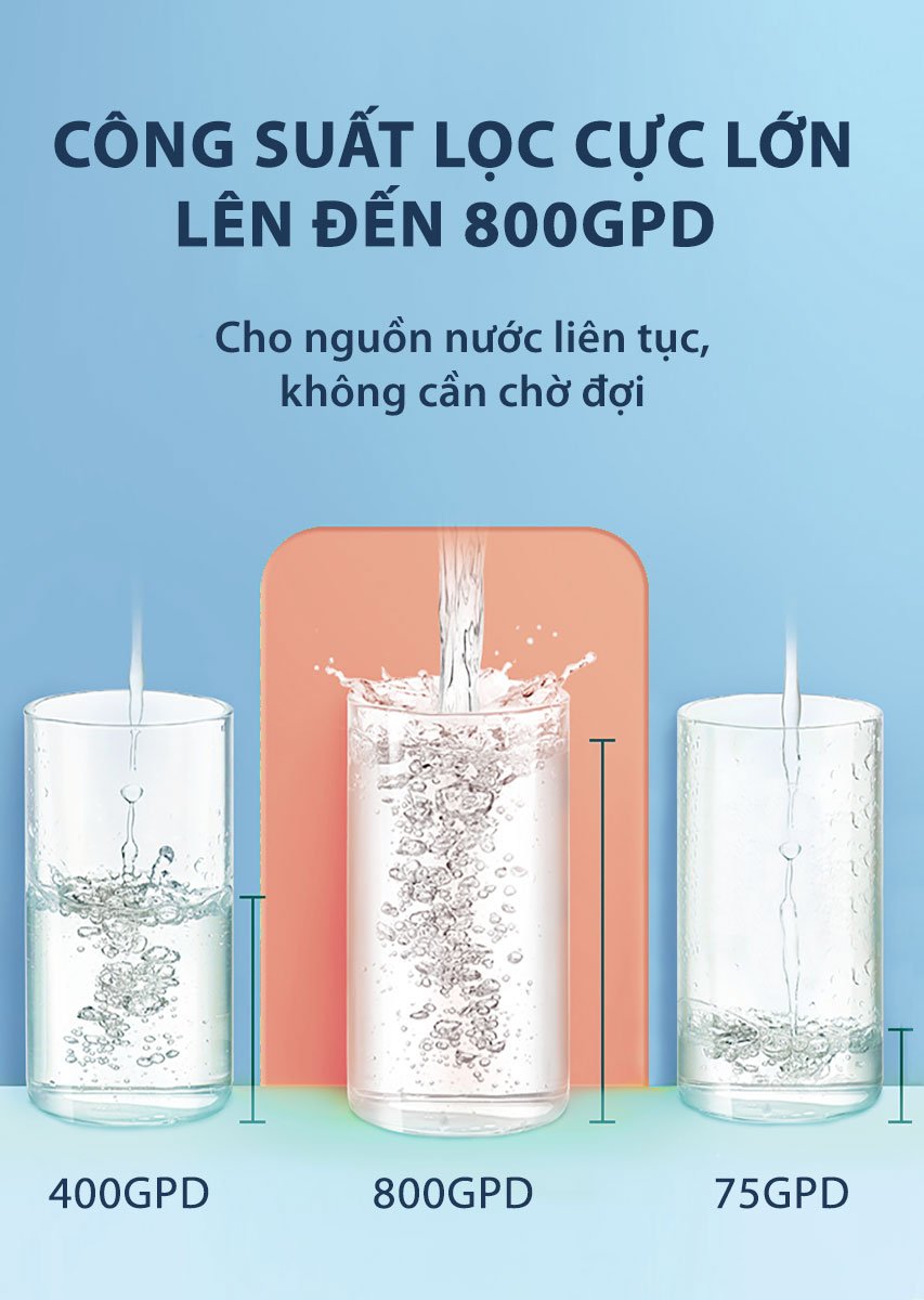 Công suất lọc lớn nhất lên tới 2000 ml/ phút, nước được lọc trực tiếp ngay khi mở vòi đảm bảo luôn tươi mới và đáp ứng nhu cầu sử dụng nước liên tục của đại gia đình.