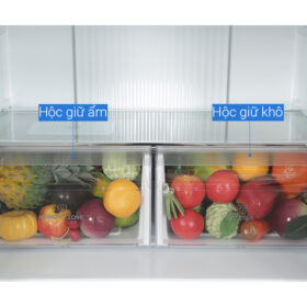 – Ngăn rau củ quả được chia thành 1 ngăn đựng thực phẩm tươi và 1 ngăn đựng thực phẩm khô, có khả năng duy trì được độ ẩm chuyên biệt để giúp bảo quản thực phẩm được tốt hơn.